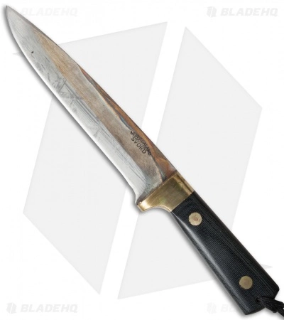 The Master Cutler range of knives from Svord are dependable hunting knives for those who demand the best. The PSB knife is has a drop point style high carbon steel blade with a two-tone finish: heat treated flats and satin grinds. The handle is polished black Micarta with a brass guard and rivets.