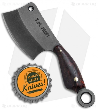 The “Leave it” Cleaver is a small keychain-sized cutting tool designed to be both fun and functional. This Cleaver features a full-tang O1 tool steel blade with a black finish and lanyard/key ring hole. Its handle has rounded burl wood scales fitted with brass pins. Comes with a secure molded sheath for safe carry.
