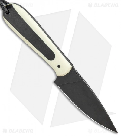 This Custom Magua fixed blade has a black G-10 handle with white G-10 inlays and a black coated blade.
