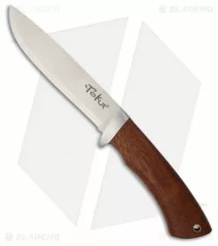The Tekut Scandi Hunter fixed blade knife is a great tool for those long back country adventures. Featuring a large 5.25″ satin drop point blade with a low scandi grind to make work of any of your trail or camp needs. Beautiful cocobolo handle with stainless steel hand guard provides and comfortable and secure grip. Include brown leather belt sheath.