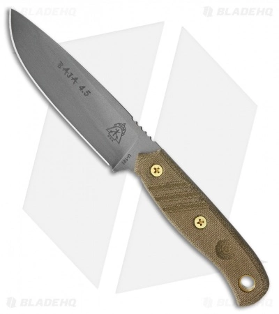 The TOPS Knives Baja 4.5 fixed blade knife with green micarta handle and Black River Wash finish is an excellent choice for the trail, hunt or camp.