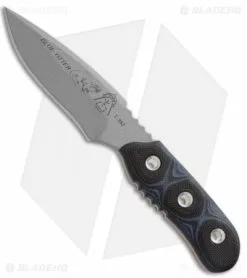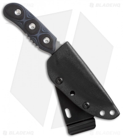 The Blue Otter fixed blade shares a few qualities of the aquatic animal, with a smart and careful design that maximizes utility while maintaining a pleasant overall size. It has a gray coated 1095 high carbon steel blade and blue/black G-10 scales with tube rivet construction. The Blue Otter includes a Kydex sheath.