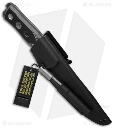 This model of the TOPS Knives BOB Fieldcraft fixed blade sports layered white/black G-10 scales and a gray finished blade. It includes a Kydex sheath and a firestarter set.