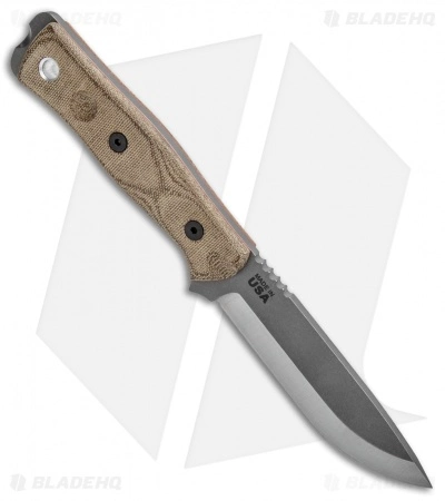 This model of the TOPS Knives BOB Fieldcraft fixed blade sports green canvas Micarta scales and a gray finished 154CM blade. It includes a Kydex sheath and a firestarter set.
