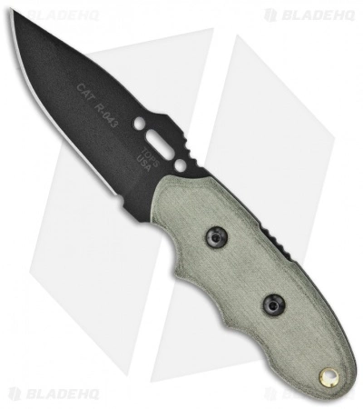 The C.A.T. #200 is a small, strong and highly versatile knife that is easy to use and maintain. Black traction coated spear point blade and full-tang handle with black linen Micarta scales. Kydex sheath with rotating steel spring clip.