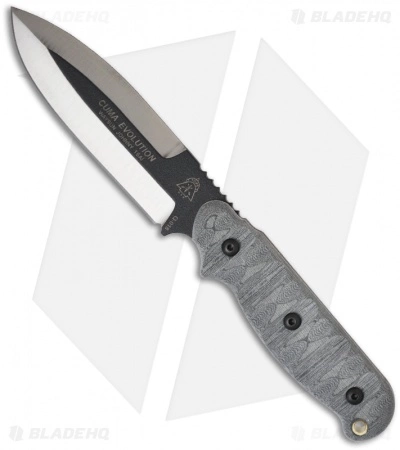 TOPS Knives’ Cuma Evolution has a stout 1095 steel blade with a black traction coating and upper and lower edges. The bottom edge is sharpened and offers almost 5″ of cutting power. The handle scales are black linen Micarta with Rocky Mountain Tread (RMT), an aggressive array of grooves for outstanding grip. Included with the Cuma Evolution is a heavy duty black nylon sheath.