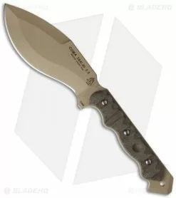 The Cuma Tak-Ri has a 3/16″ thick full-tang 1095 steel Kukri blade with milled Micarta scales. The tan coated blade has a long sweeping edge with an unsharpened top edge. The handle is designed to give the user the ability to not only use this knife in full chopping/swinging mode, but also to choke up on the blade for more delicate tasks. The base of the handle can be used to pry and scrape, further extending the ground this knife can cover.