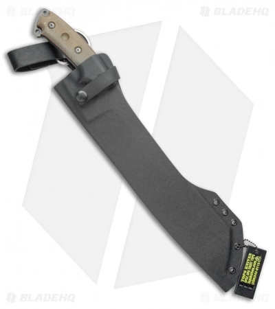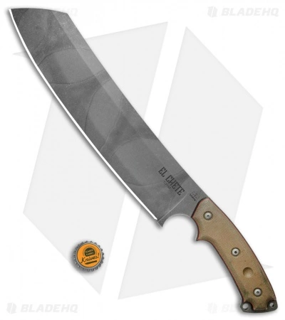The TOPS El Chete is a massive fixed blade designed to make quick work of any chopping task. Its blade is fashioned from full-tang, quarter-inch thick 1095 tool steel with a camo finish. The sandwiched Canvas Micarta handle is shaped to fit the hand like a hatchet or small ax handle for comfortable and secure use. This beastly chopping knife includes an out-the-front designed Kydex sheath with a dangler carry attachment.