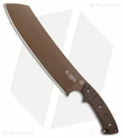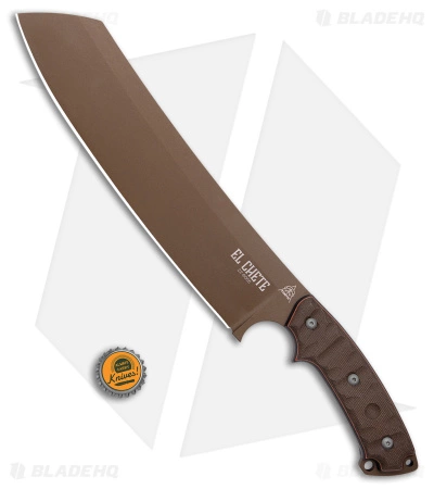 The TOPS Knives El Chete is a massive fixed blade designed to make quick work of any chopping task. Its blade is fashioned from full-tang, quarter-inch thick 1095 high carbon steel with a bronze finish. The sandwiched canvas micarta handle is shaped to fit the hand like a hatchet or small axe handle for comfortable and secure use; it features TOPS‘ custom Rocky Mountain Tread texture. This beastly chopping knife includes an out-the-back design Kydex sheath.