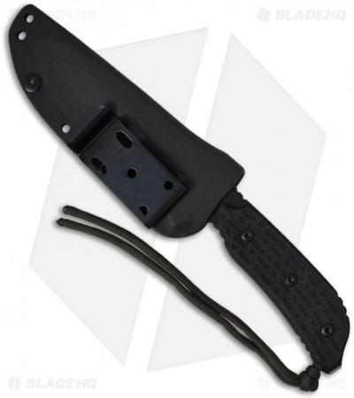 The MIL-SPIE 5 is more adept at belt or vest carry, while still maintaining a low profile. The scales are black linen micarta with our dot dash dot pattern imbedded in the handle. The handle scales are removable and the skeletonized knife seems to be as popular as the one with handles. The blade has a black traction coating.