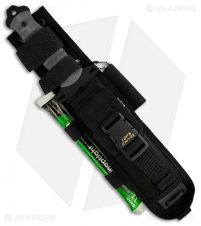 The Survival Tactical 7 bridges the line between survival-specific and tactical-specific functionality, giving the user the best for both end uses. Designed by Joseph Teti and built by TOPS Knives, the SURV TAC 7 is an excellent tool. Its blade has a modified tanto point, sharpened upper point edge and a tough saw back spine. The handle is outfitted with Rocky Mountain Tread (RMT) black linen Micarta scales for excellent grip. The tang extends to reveal both a lanyard hole and a pry bar pommel. The Survival Tactical 7 comes with a heavy duty nylon sheath that includes a light stick, fire starter, whistle and sharpener.