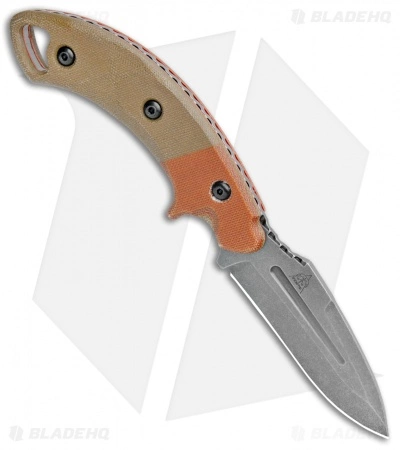 From TOPS and Viking Tactics, the Crusader is a medium sized knife. The green and orange micarta handle is contoured to provide an ergonomic grip ideal for close up work, slashing, and penetration alike. Through it all this knife is solid as a rock. The spine of the knife is milled with unique ridges, adding grip and style. Included is a firm, brown kydex sheath, belt attachment straps, and a whistle.