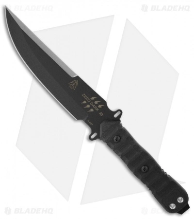 The Zero Dark 30 knife from TOPS Knives boasts a 3/16 thick steel clip point blade with a ground upper edge (non-sharpened) and Rocky Mountain Tread (RMT) linen Micarta scales for unparalleled grip. The Zero Dark 30 knife comes includes a ballistic nylon sheath with external pocket to stash a folder, kits, etc.