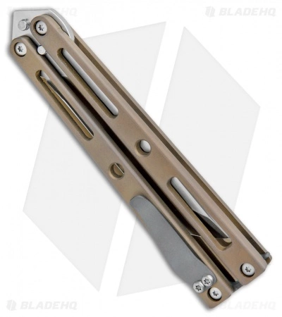 This VMX Butterfly knife sports a bronze stonewashed titanium handle and a satin finished tanto blade.