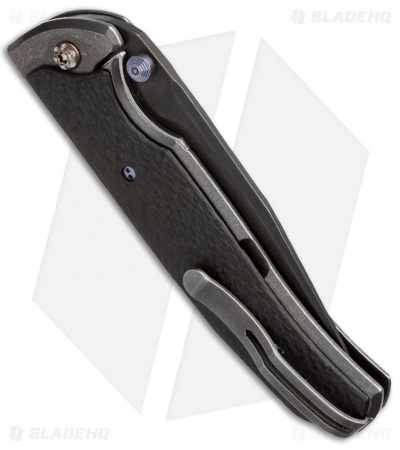 This custom Diskin dual-action automatic knife from Matt is a very stylish, well-made piece. It has a dark stonewash finished titanium frame and lock tab (with steel insert). The handle is dressed up with carbon fiber scales and a lighting strike carbon fiber back-spacer. The Elmax blade is dark gray finished and sports thumb studs for opening. This dual action automatic knife is set up with a front scale release and the action is sweet and strong. The Diskin D/A comes complete with a steel tip-up pocket clip.