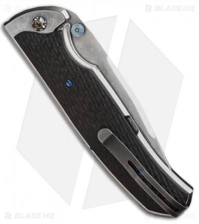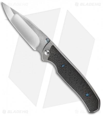 This custom Diskin dual-action automatic knife from Matt is a very stylish, well-made piece. It has a tumbled titanium frame and lock tab (with steel insert). The handle is dressed up with carbon fiber scales and a lightning strike carbon fiber back spacer. The blade has polished compound grinds and tumbled faces. It sports anodized titanium thumb studs for opening. This dual action automatic knife is set up with a front scale release. The action is sweet and strong. The Diskin D/A comes complete with a steel tip-up pocket clip.
