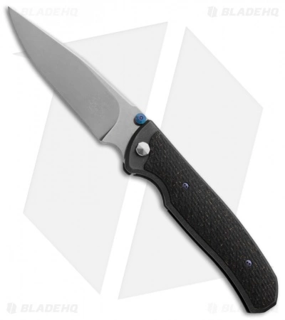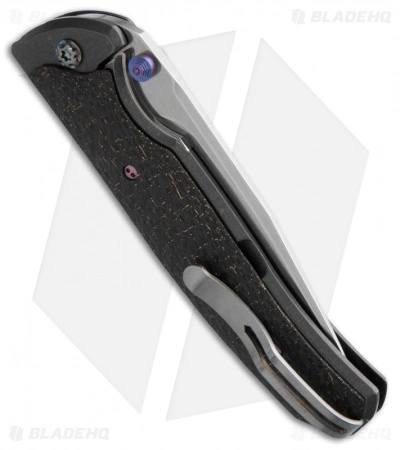 This custom Diskin dual-action automatic knife from Matt is a very stylish, well-made piece. It has a acid washed finished titanium frame and lock tab (with steel insert). The handle is dressed up with lightning strike carbon fiber scales and back spacer. The Elmax blade is tumble finished and sports anodized titanium thumb studs for opening. This dual action automatic knife is set up with a front scale release. The action is sweet and strong. The Diskin D/A comes complete with a steel tip-up pocket clip.