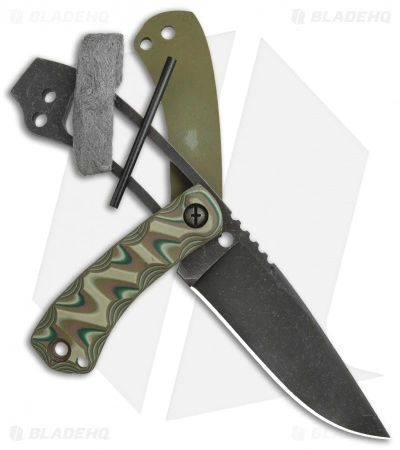 - Multicam G-10 handle scales over a hollow, full tang that holds the included ferro rode and steel wool.